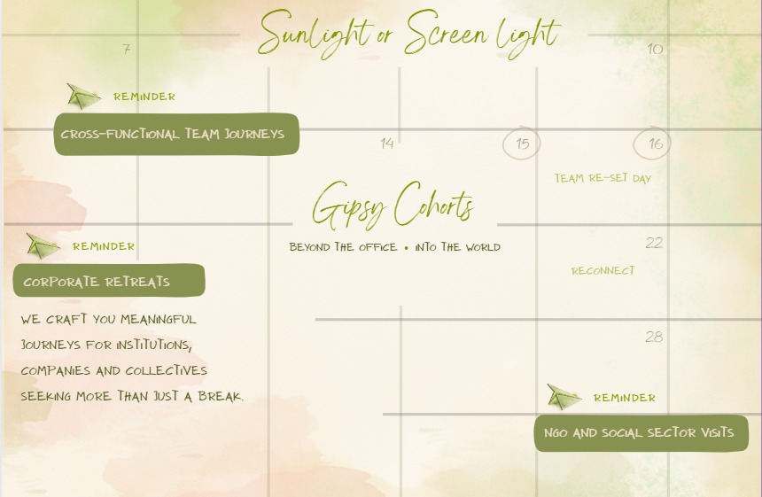 We craft you meaningful journeys for institutions, companies, and collectives seeking more than just a break. Whether it’s for learning, bonding, or exposure, Gipsy Cohorts offers curated experiences that align with your group’s goals.